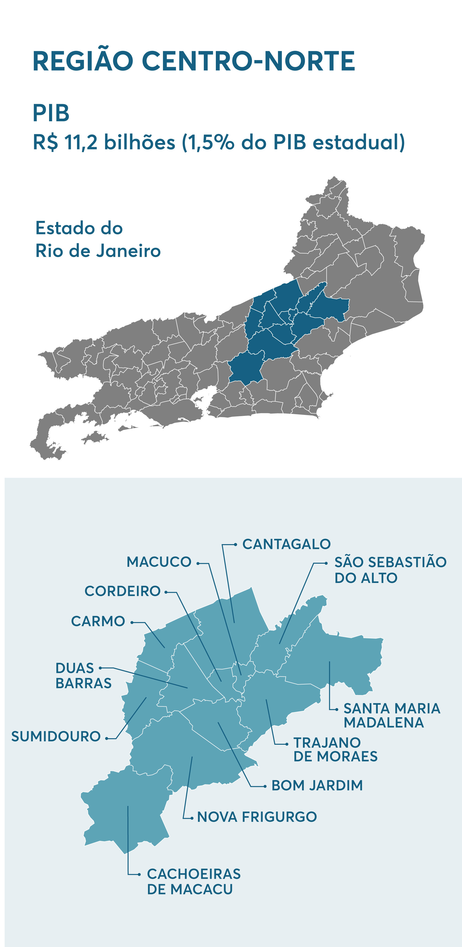 A região Centro-Norte é rica em várias atividades, tanto a industrial como a turística e a rural. Composta por 12 municípios, em 2020 atingiu o PIB de R$ 11,2 bilhões, que corresponde a 1,5% do PIB estadual. A indústria responde por 13,3% do PIB da região. Concentra o principal polo metalmecânico fluminense, setores de plástico, cimenteiro, têxtil, com destaque para a indústria de vestuário de moda íntima, fitness e praia; sem contar a produção de hortaliças, flores, laticínios, cervejas, cachaça e trutas. Para escoar todos esses produtos é necessário melhorias em suas principais estradas estaduais.