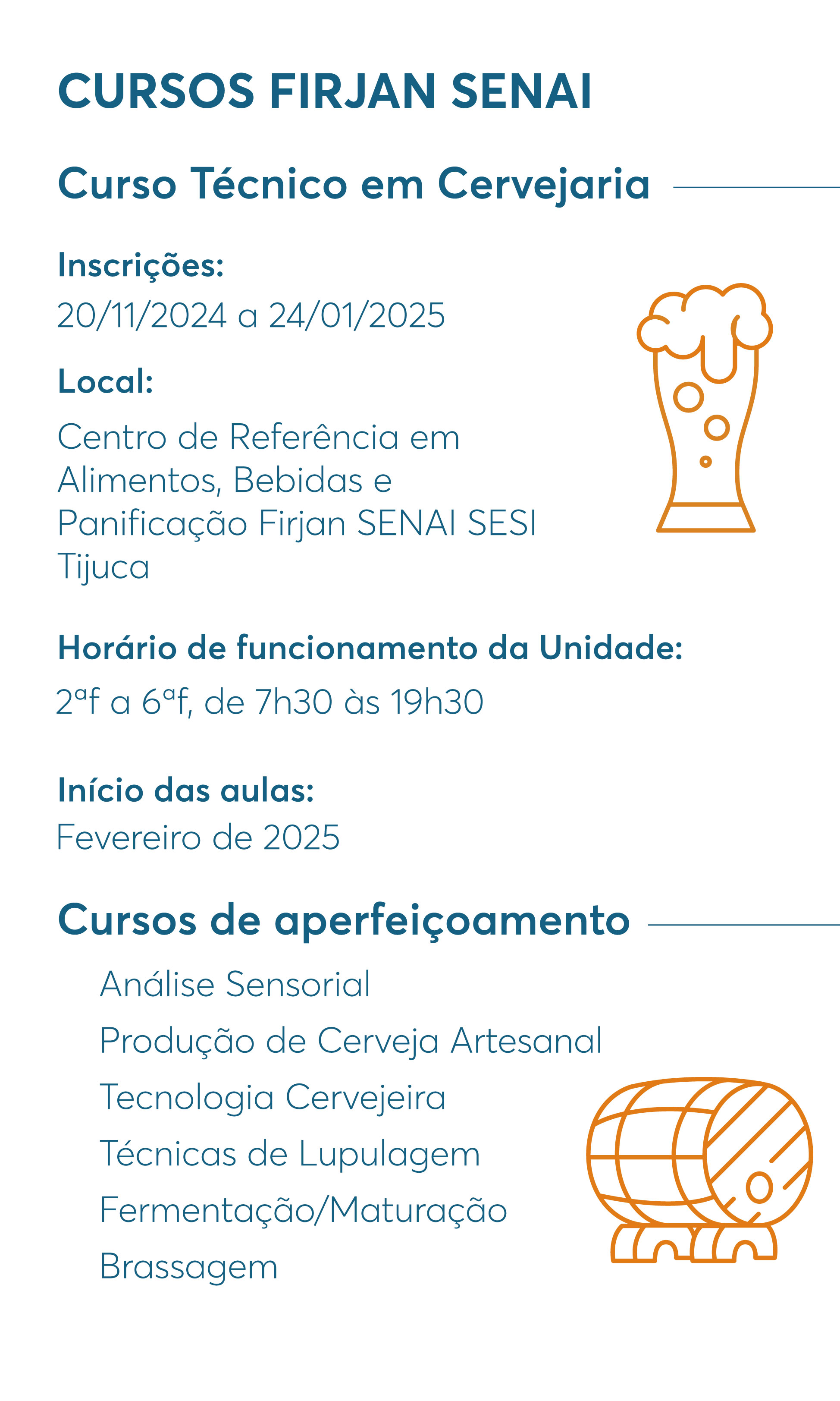 Com professores de referência nessa área, o Curso Técnico em Cervejaria da Firjan SENAI, com 1.200 horas, engloba todo o processo produtivo, desde o campo até o consumo final, passando pelas etapas de produção, qualidade, gestão, meio ambiente, segurança do trabalho, utilidades. tornando o profissional completo para atuar no mercado.