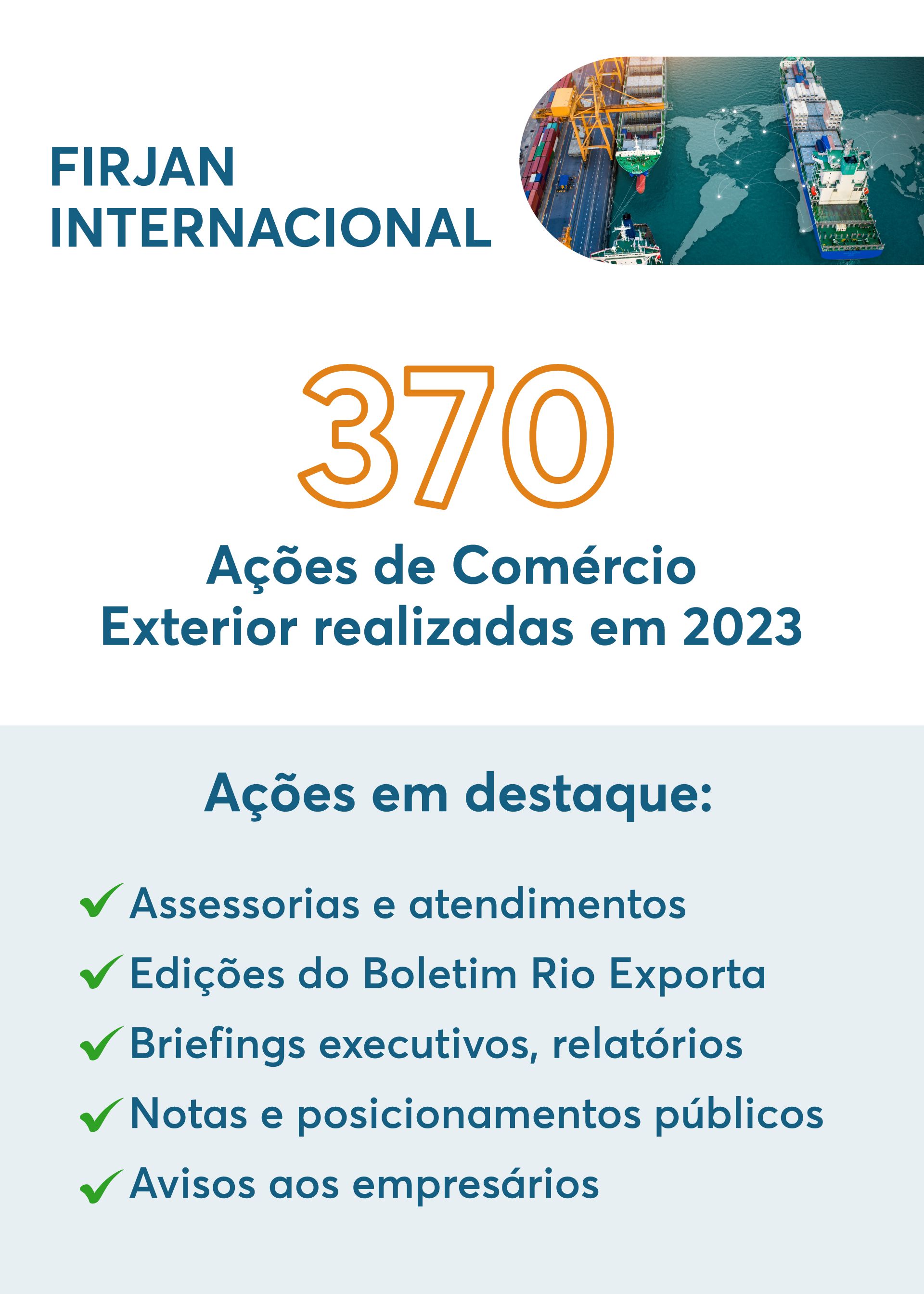 A Firjan Internacional fez em 2023 uma média de 370 ações ligadas ao comércio exterior e relações internacionais. A atuação se reflete no bom desempenho do Rio na balança comercial no ano passado, quando o estado acumulou uma corrente de comércio de US$ 76 bilhões, com alta de 3% ante 2022, e um saldo comercial superavitário em US$ 23,8 bilhões.