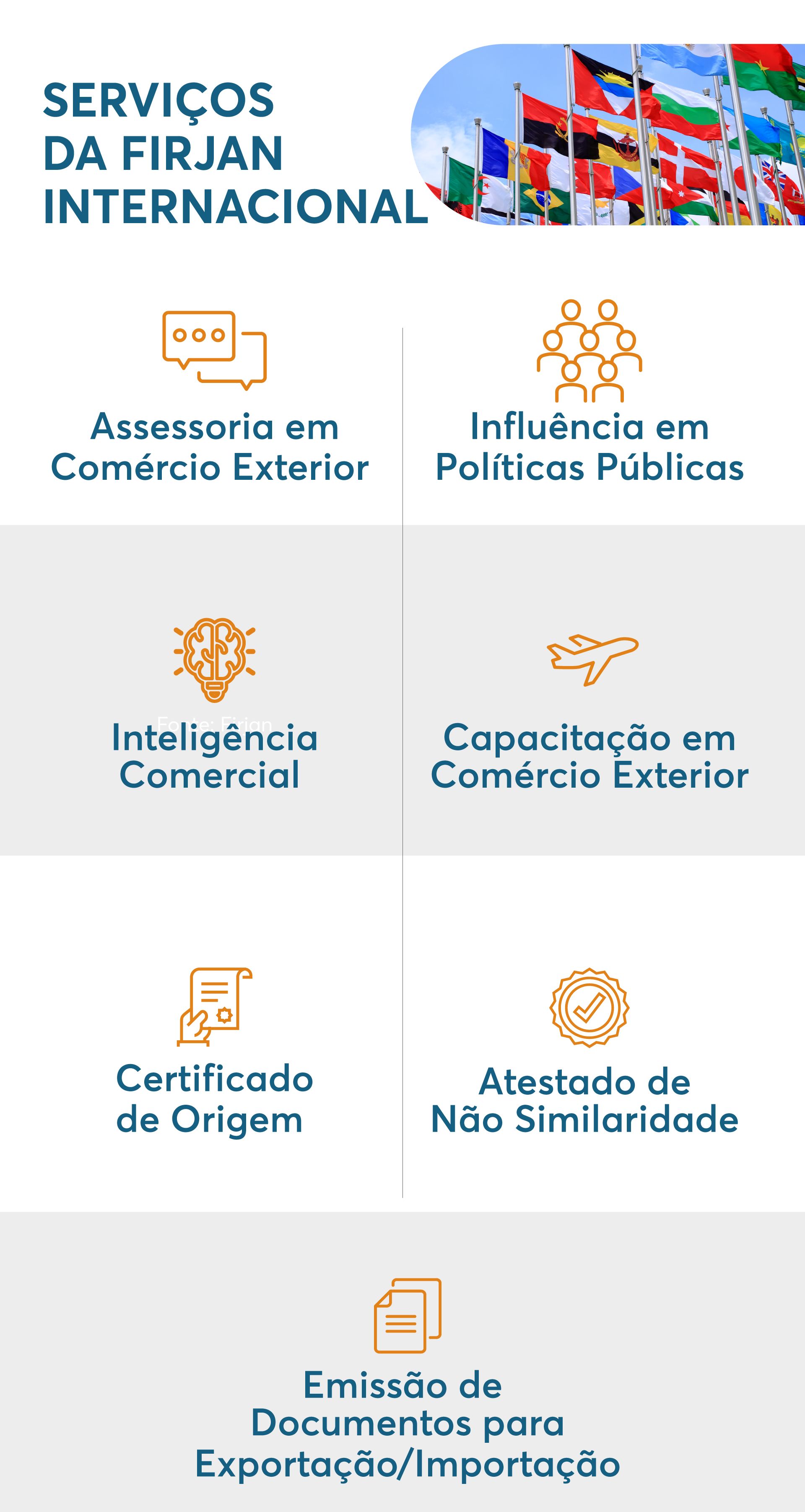 Assessoria em comércio exterior, emissão de documentos como certificado de origem e atuação em prol de políticas públicas favoráveis à indústria fluminense são alguns dos serviços oferecidos pela Firjan Internacional para ajudar as empresas a participar do mercado global. O objetivo é ampliar mercados fora do Brasil, favorecer parcerias comerciais e contribuir para a construção de um ambiente positivo para os negócios internacionais no estado do Rio de Janeiro.