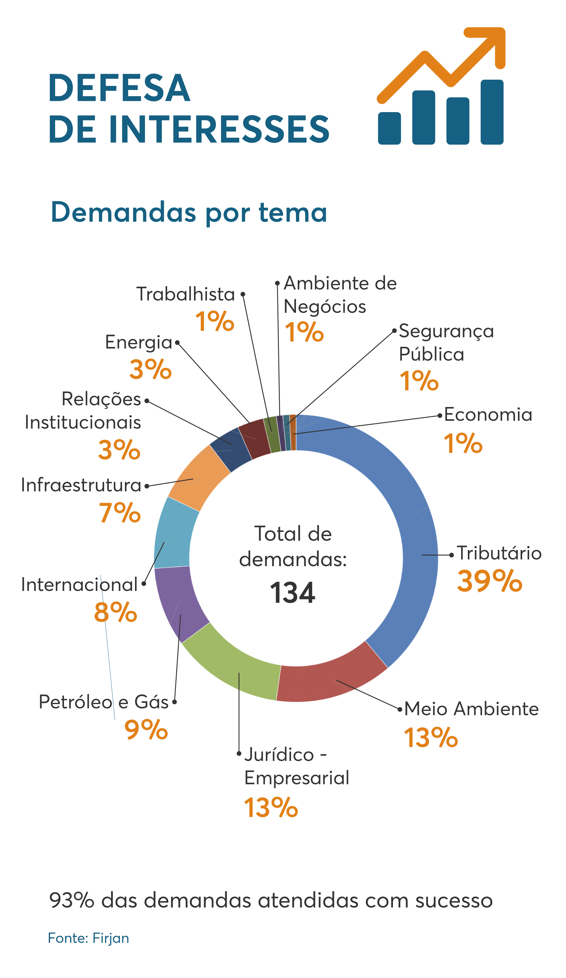 Além da Agenda 4.0 nacional e estadual, a Firjan recebe ao longo do ano inúmeras demandas de defesa de interesses, que costumam vir principalmente da parte dos sindicatos filiados, das empresas associadas, dos Conselhos temáticos e das Representações Regionais da federação. Das demandas atendidas este ano, 93% tiveram sucesso. As questões tributárias, de meio ambiente e jurídico-empresarial foram as mais pedidas.
