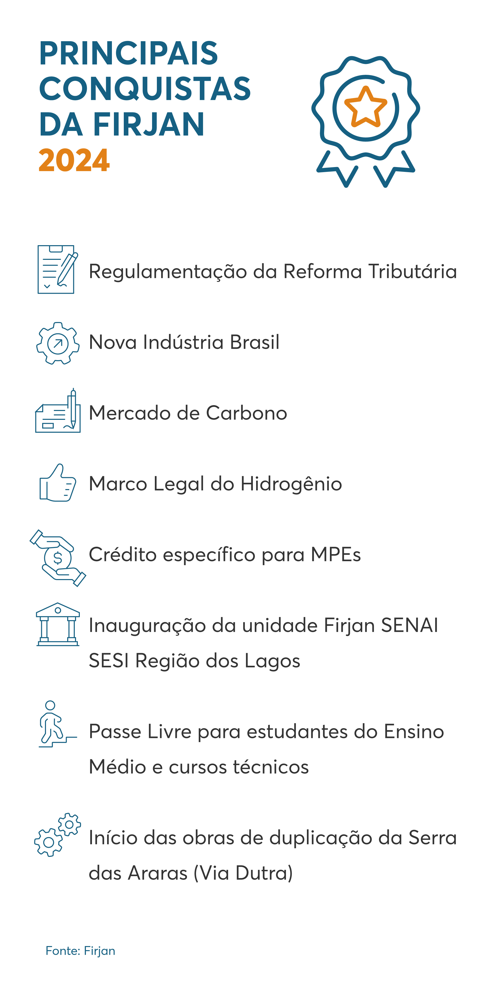 A maior parte das conquistas de 2024 faz parte da Agenda Propostas Firjan para um Brasil 4.0. Regulamentação da Reforma Tributária, lançamento da Nova Indústria Brasil (NIB), criação do Mercado de Carbono e de linhas de crédito específicas para micro e pequenas empresas (MPEs) e o Marco Legal do Hidrogênio foram alguns dos avanços da Firjan junto ao governo federal e ao Congresso Nacional em 2024, que vão ao encontro dos objetivos da Agenda 4.0. No âmbito estadual, foi sancionada, no fim de novembro, a Lei que institui o passe livre para estudantes bolsistas do Ensino Médio e Técnico do Sistema S, uma proposta da federação. Conheça mais sobre cada um desses pontos e a inauguração da unidade Firjan SENAI SESI Região dos Lagos.
