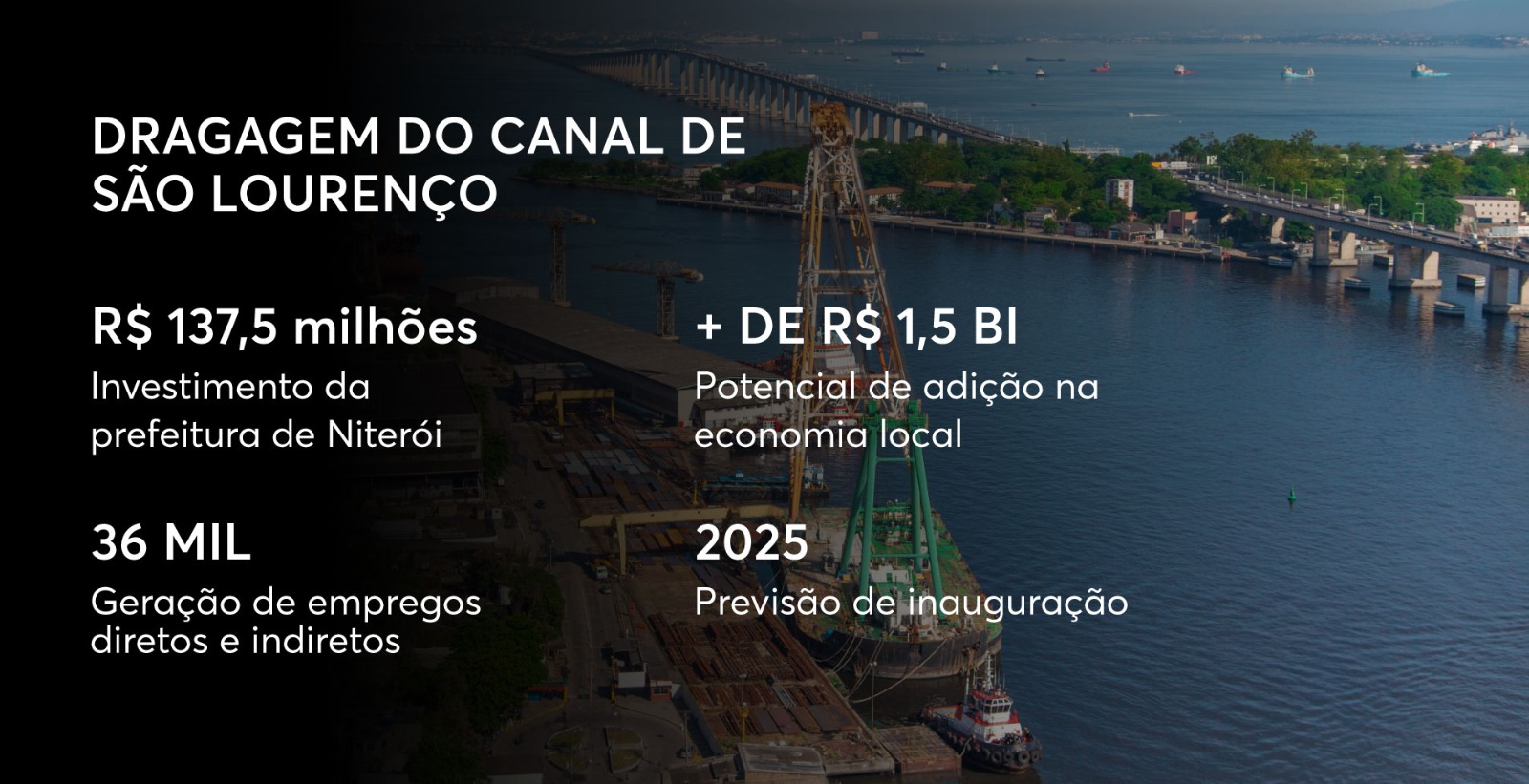 Já a obra de dragagem do Canal de São Lourenço, esperada há mais de 30 anos, tem o objetivo de ampliar o acesso da infraestrutura aquaviária ao Complexo Industrial e Portuário de Niterói – e deve revitalizar todo o setor. Realizada pela Prefeitura de Niterói, com investimento de R$ 137,5 milhões, faz parte do projeto voltado para Economia do Mar.