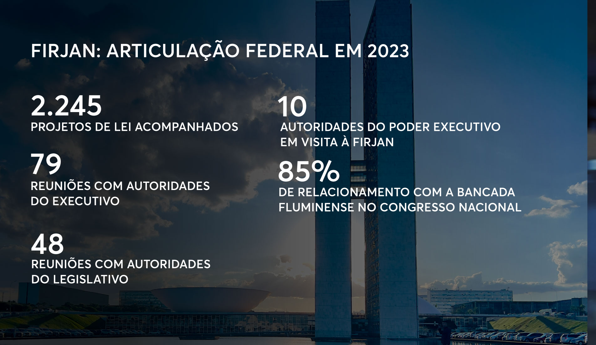 Reforma Tributária, crédito de carbono e segurança pública foram os principais temas discutidos pela Firjan em 2023 com autoridades federais. A federação acompanhou mais de 2.240 projetos de lei e articulou reuniões com autoridades do novo governo, como o ministro da Fazenda, Fernando Haddad, e o vice-presidente e ministro do Desenvolvimento da Indústria, Comércio e Serviços, Geraldo Alckmin. Além disso, 10 autoridades do Poder Executivo e nove do Legislativo visitaram a Firjan, e houve 127 reuniões com representantes desses dois poderes, considerando a esfera nacional.