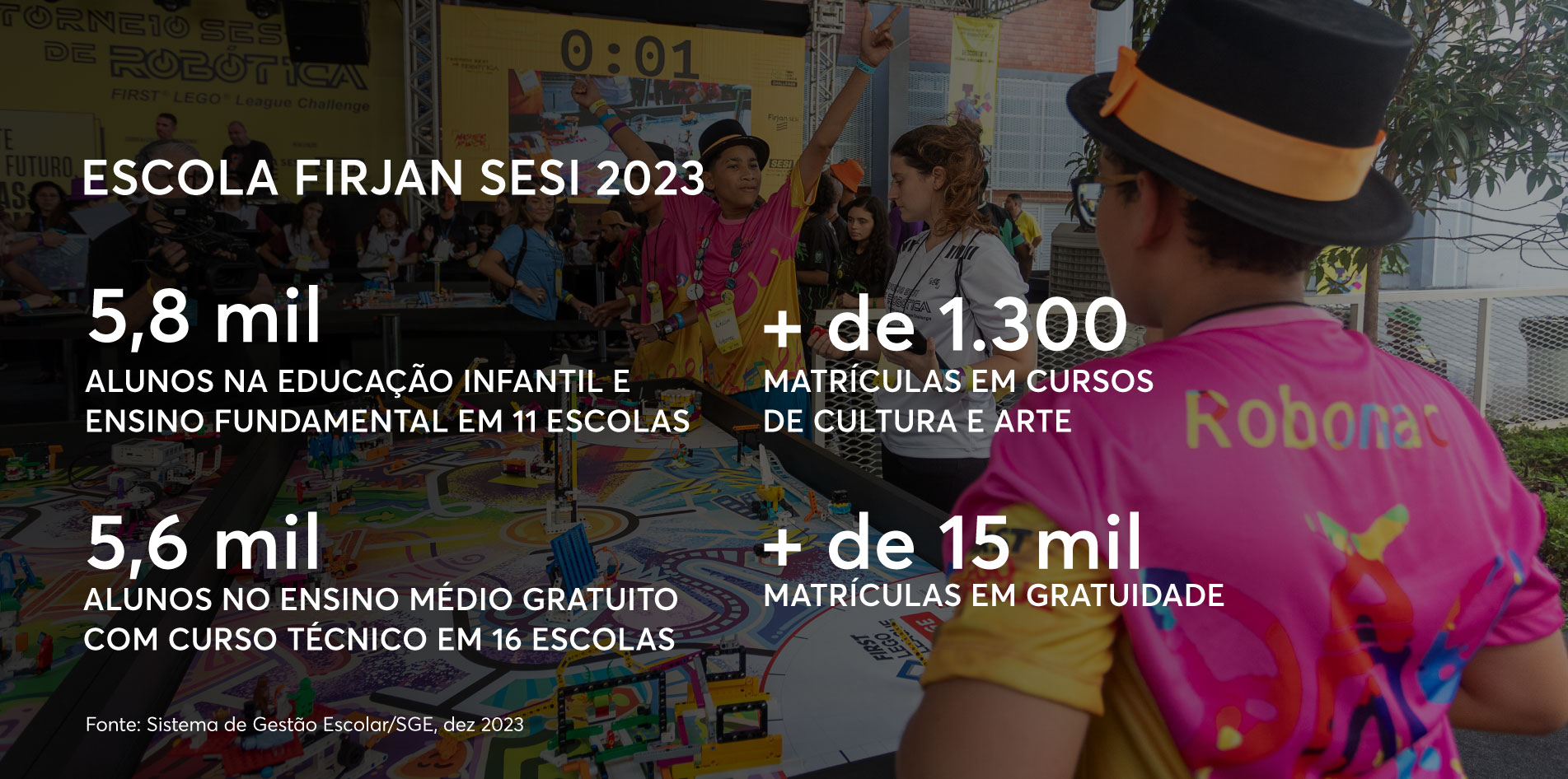 A Firjan SESI prepara o aluno para um futuro de possibilidades, valorizando as novas tecnologias, a robótica, a inovação, a arte e o senso crítico. No Ensino Médio com Curso Técnico, mais de 5.500 alunos tiveram gratuidade em 2023. Os campeonatos de robótica movimentam as equipes, e a conquista do passaporte para as etapas nacional e internacional emociona os participantes.
