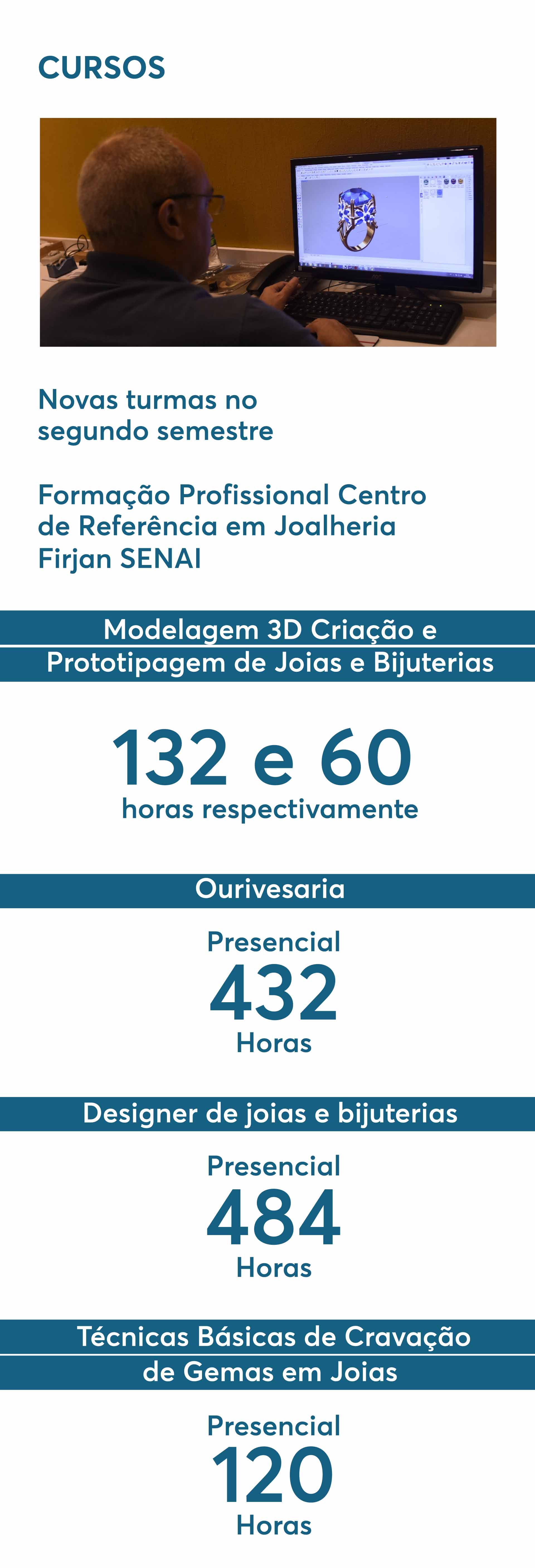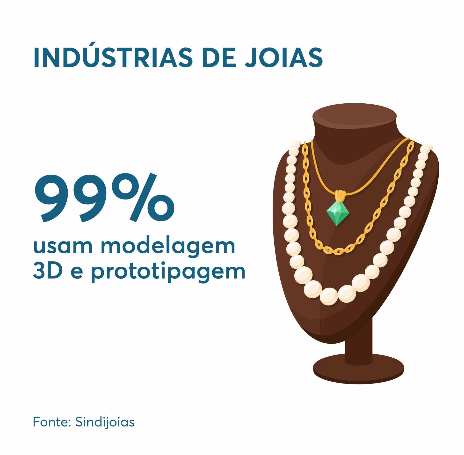Quase 100% das indústrias de joias trabalham com modelagem 3D e prototipagem, abrindo um amplo leque de oportunidades para especialistas no setor. Essa tecnologia impulsionou o mercado, ao facilitar o trabalho do design, viabilizar projetos anteriormente inviáveis manualmente e possibilitar uma maior precisão no processo da produção, além de gerar economia. O ambiente favorável ao mercado intensificou a criação de cursos de modelagem 3D de joias e bijuterias, além dos de ourivesaria e designer de joias oferecidos pelo Centro de Referência em Joalheria da Firjan SENAI, no Maracanã.
