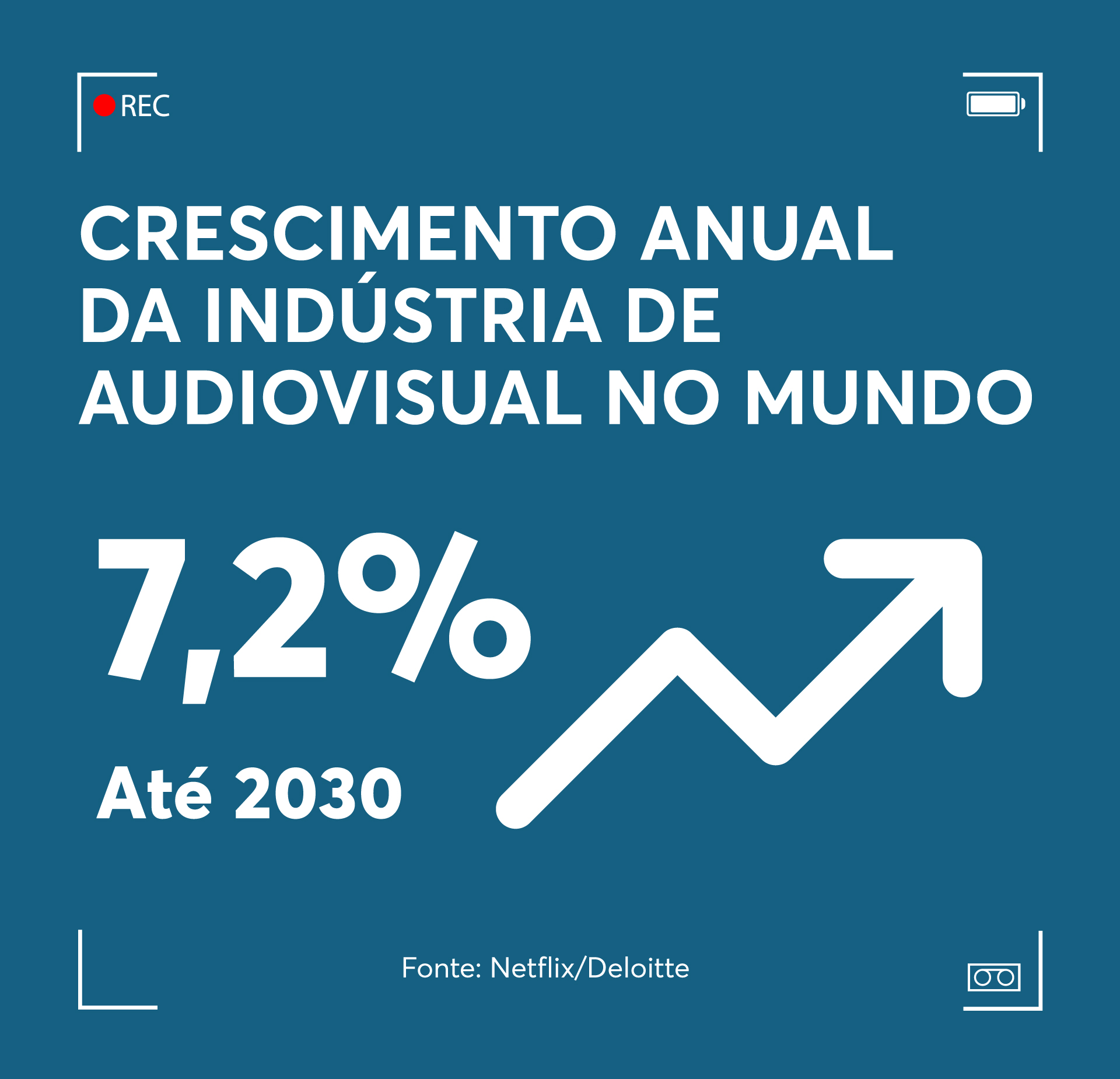 A indústria audiovisual recebeu recentemente uma injeção de ânimo com a sanção da Lei de Cotas de exibição de conteúdo nacional nos cinemas e na TV paga, conhecida como “cota de tela”. Por sua vez, a Lei Paulo Gustavo movimenta mais de R$ 2,7 bilhões no país. Estima-se que o setor contribua com mais de R$ 27 bilhões para o PIB brasileiro. Aliado a esses números, o levantamento “O impacto econômico do audiovisual na América Latina” (Netflix/Deloitte) prevê um crescimento anual de 7,2% da indústria audiovisual mundial até 2030.