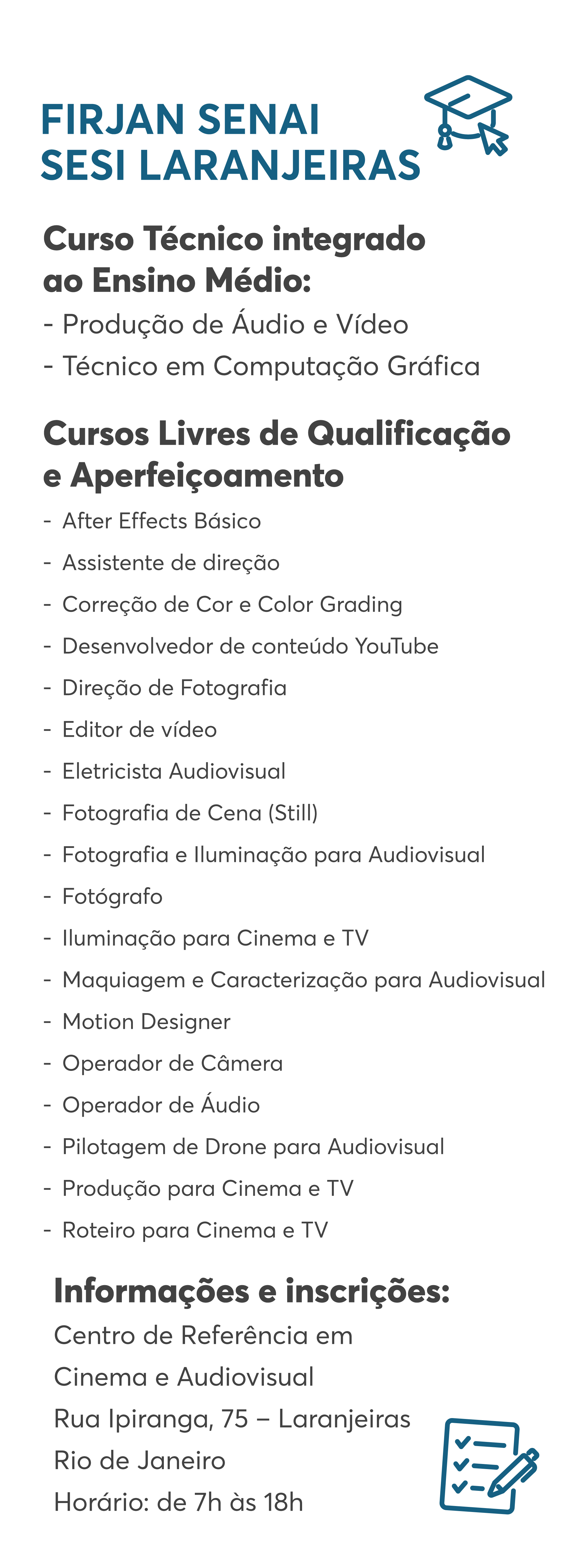 A 1ª turma de Ensino Médio da Escola Firjan SESI + Técnico em Cinema e Audiovisual, pela Firjan SENAI, se formou em dezembro passado. Foram 127 alunos, que durante três anos aprenderam roteiro, direção, fotografia, design gráfico, áudio, câmera, produção e várias outras disciplinas, na teoria e na prática. Tudo isso aliado ao Ensino Médio regular gratuito.